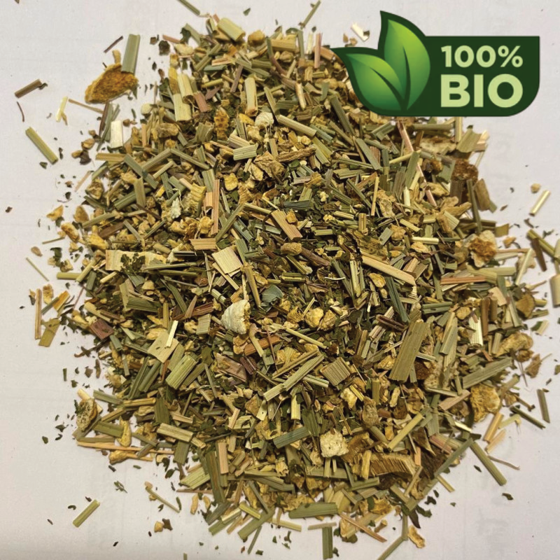 Jengibre, lemongrass, hierbabuena, regaliz y cáscara de limón. Ingredientes procedentes de cultivo ecológico.