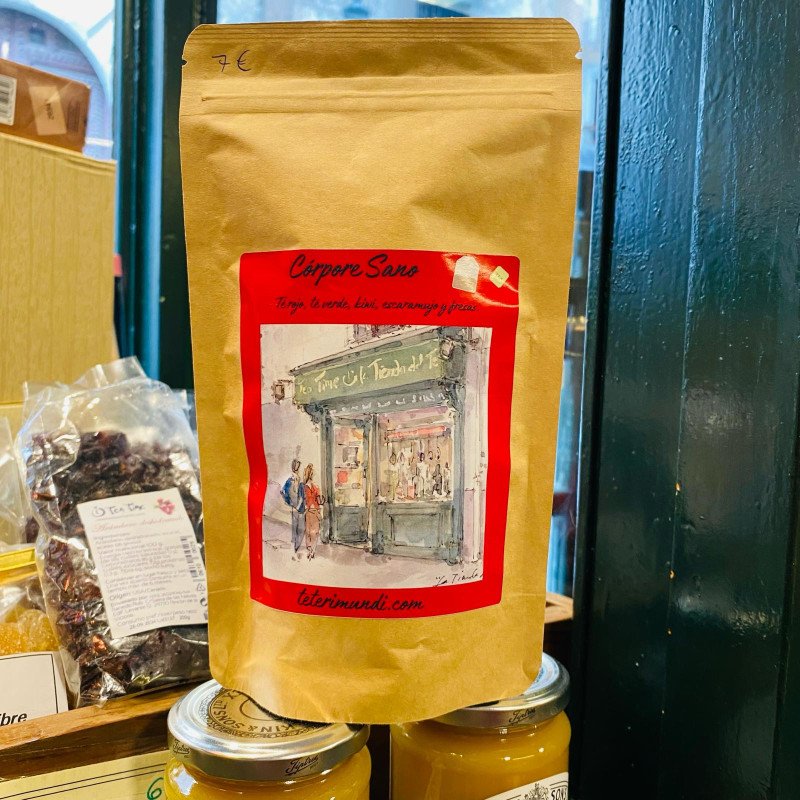 Té negro, violetas, madroños, rosas, fresa y papaya. Cada bolsa contiene 10 pirámides de té.